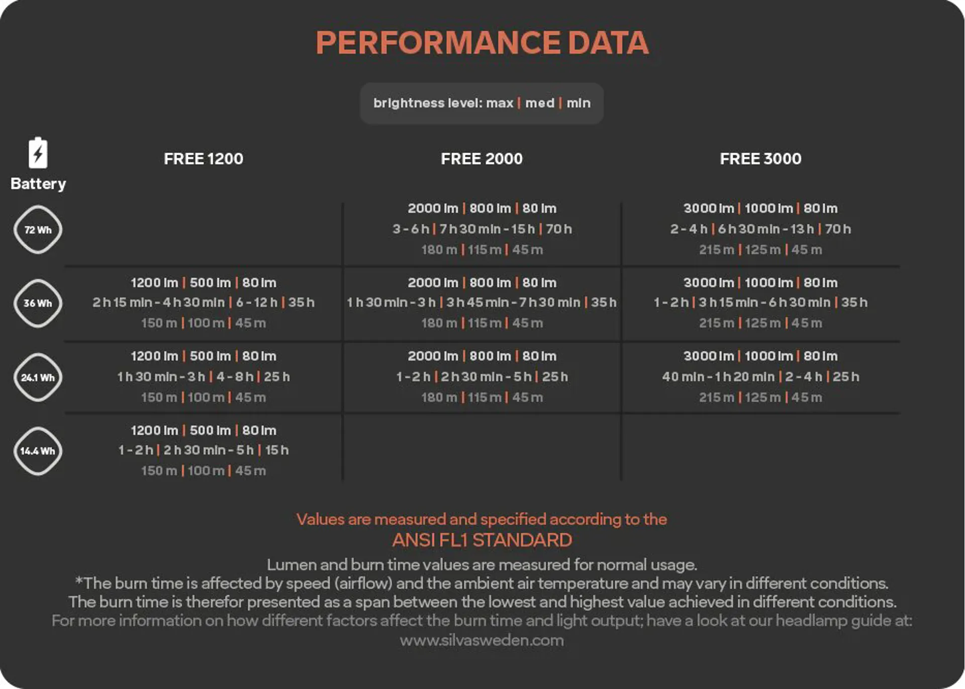 Choosing the right headlamp is all about finding the right balance between lumen (light), burn time and weight. These are all affected by each other, so finding the right balance for you depends on what activity you will be using your headlamp for. Therefore, you need to consider the relationship between brightness and how long you want spend time outdoor, as well as the speed and terrain. The faster you move and the more challenging terrain, the more powerful light you need. Choose Free 1200 and a lighter battery when your main activity is trail running, cross country skiing and ski touring. Choose Free 2000-3000 and a heavier battery when you move at high speed and in demanding terrains like mountain biking, ski mountaineering and skiing.