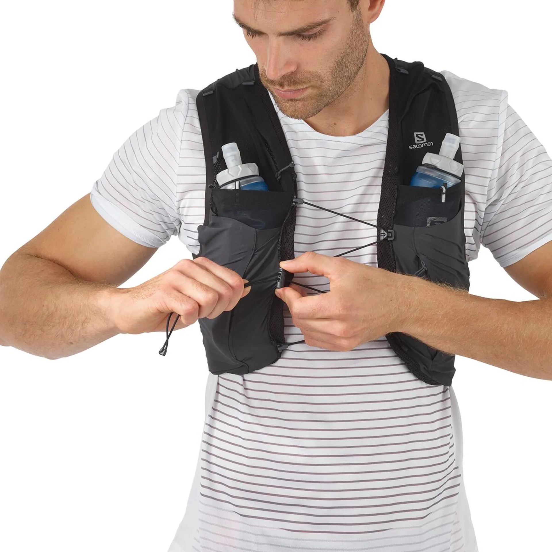 • 2 front flask pockets with secure loops - designed to fit Salomon soft flasks, these front pockets limit bouncing. Top elastic loops secure your flasks and keep them ready to drink.